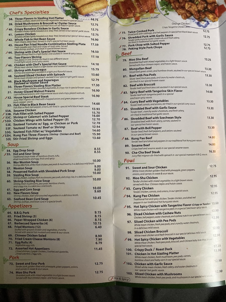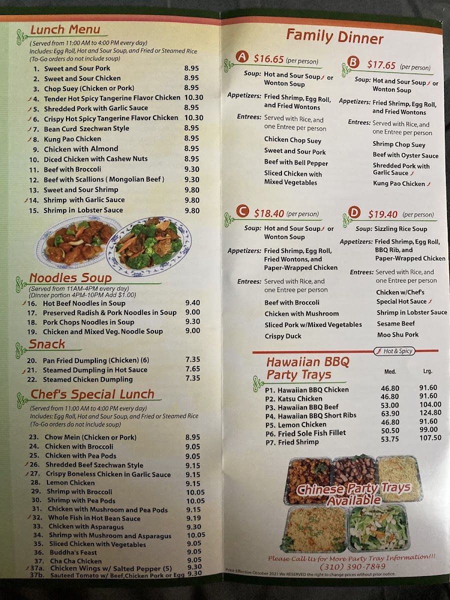 Choose one of the entrees: Chicken with Chef's Special Hot Sauce ???? Shrimp in Lobster Sauce Sesame Beef Moo Shu Pork Hot and Sour Soup ????, Wonton Soup, Sizzling Rice Soup Served with Rice, and Appetizers (Fried Shrimp, Egg Roll, B.B.Q. Ribs, and Paper-Wrapped Chicken)
